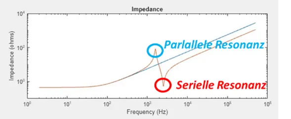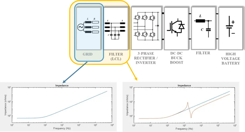L’exemple suivant illustre l’influence d’un filtre d’entrée LCL d’une borne de recharge électrique sur l’impédance du réseau, qui dépend de la fréquence, au niveau d’un point de raccordement du réseau de distribution. Alors que le réseau de distribution électrique et ses composants présentent un comportement ohmique-inductif, un point de résonance parallèle-série apparaît lors du raccordement d’une borne de recharge électrique.