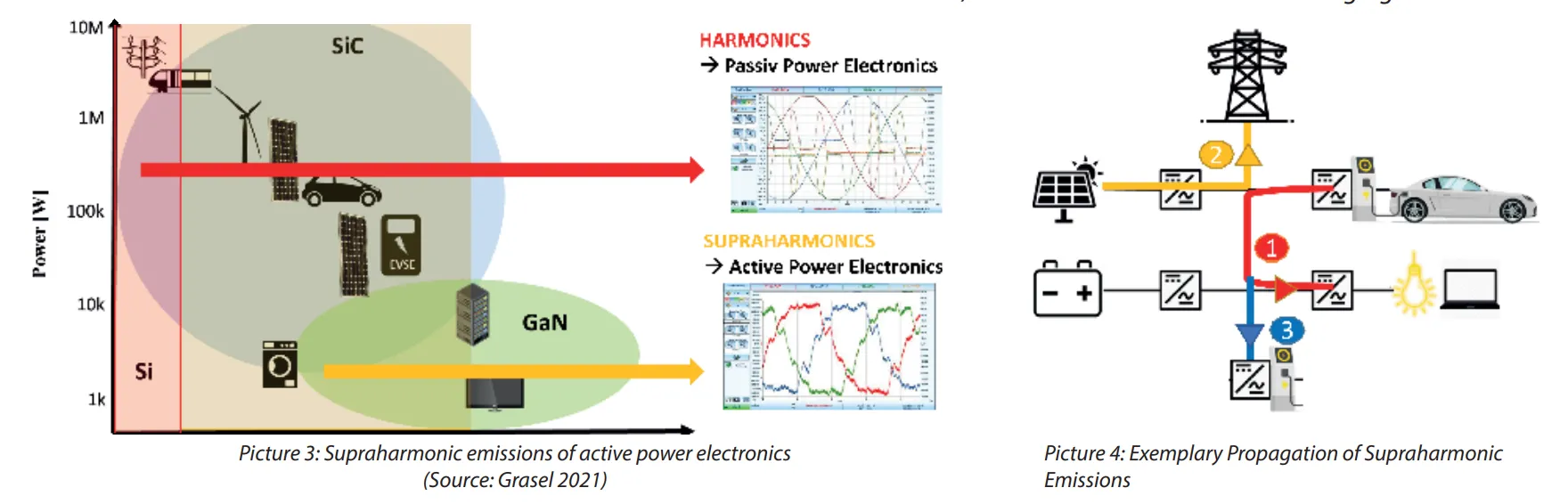 Émissions supra-harmoniques dans la gamme de 10 kHz à 500 kHz dues à l’électronique de puissance active telle que le photovoltaïque, les chargeurs de véhicules électriques, l’énergie éolienne, les pompes à chaleur…